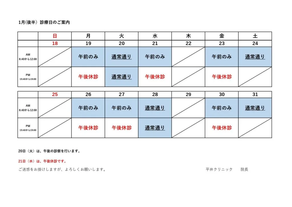 1月(後半)の診療日カレンダーです。 ご不便をおかけいたしますが、宜しくお願い致します.