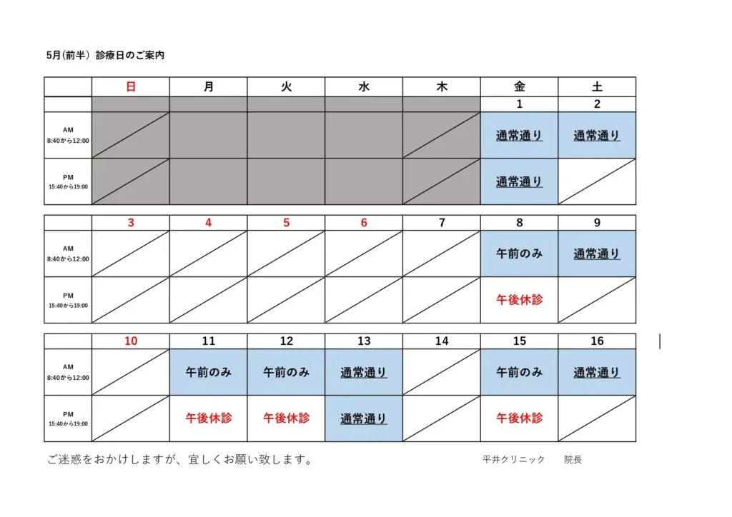 5月(前半)の診療日カレンダーです。 5月1日(金)午前・午後 と 2日(土)午前 診療致します。 ご不便をおかけいたしますが、宜しくお願い致します。